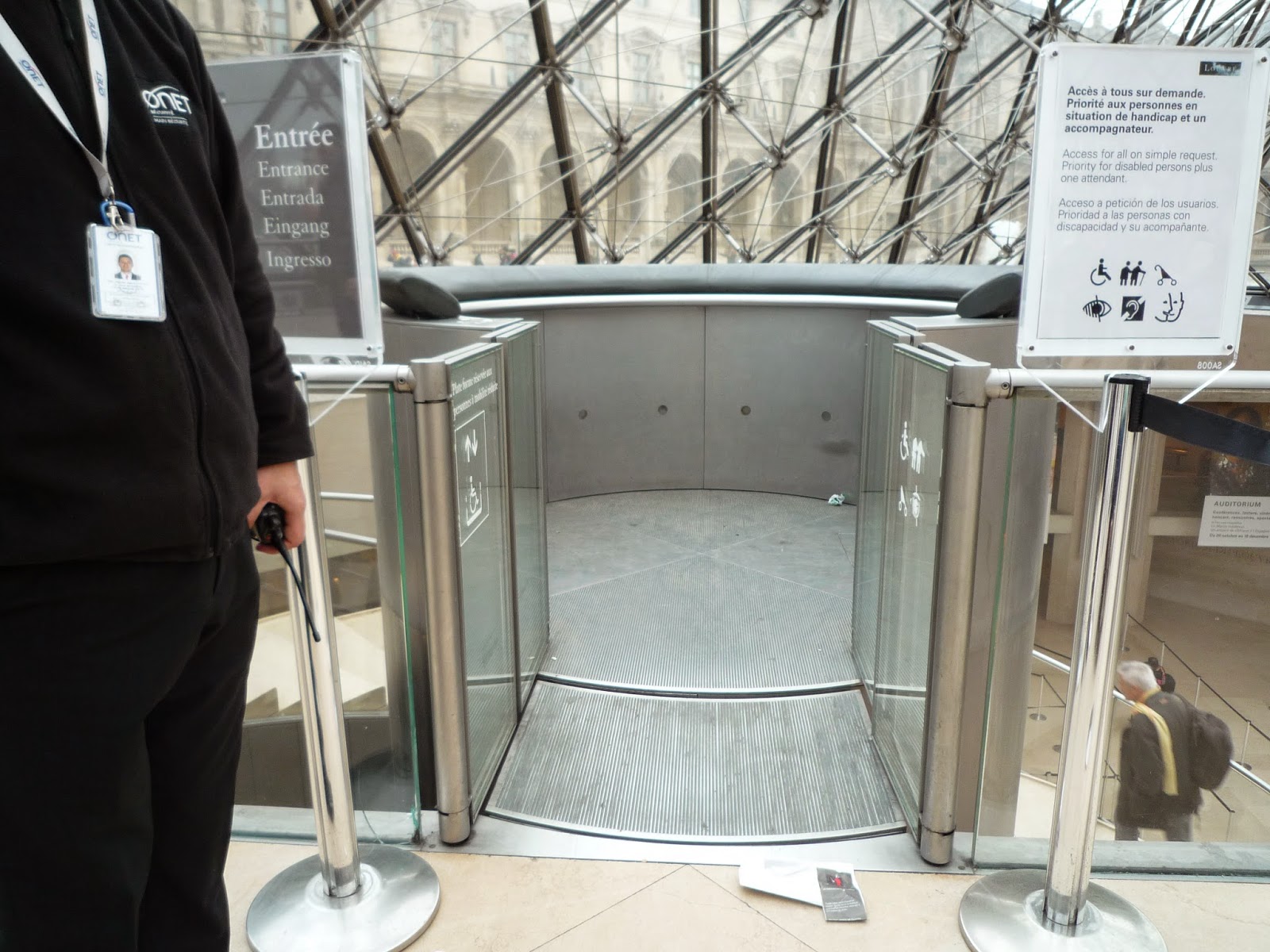 L’entrée principale se situe sous la pyramide, et les PMR ne doivent pas faire la file. Un « ascenseur », ou plutôt une colonne panoramique assez futuriste, permet de descendre jusqu’à l’entresol (photo ci-dessous). Je vous conseille ensuite de prendre un plan « spécial PMR » à l’accueil, qui indique les emplacements des différents ascenseurs. Vous pouvez aussi le télécharger ici (http://www.louvre.fr/sites/default/files/medias/medias_fichiers/fichiers/pdf/louvre-plan-guide-accessibilite.pdf) pour préparer votre visite à l’avance. Toutes les salles (ou presque) sont accessibles, mais il est souvent nécessaire de faire de gros détours et d’emprunter plusieurs ascenseurs pour éviter les nombreux escaliers.